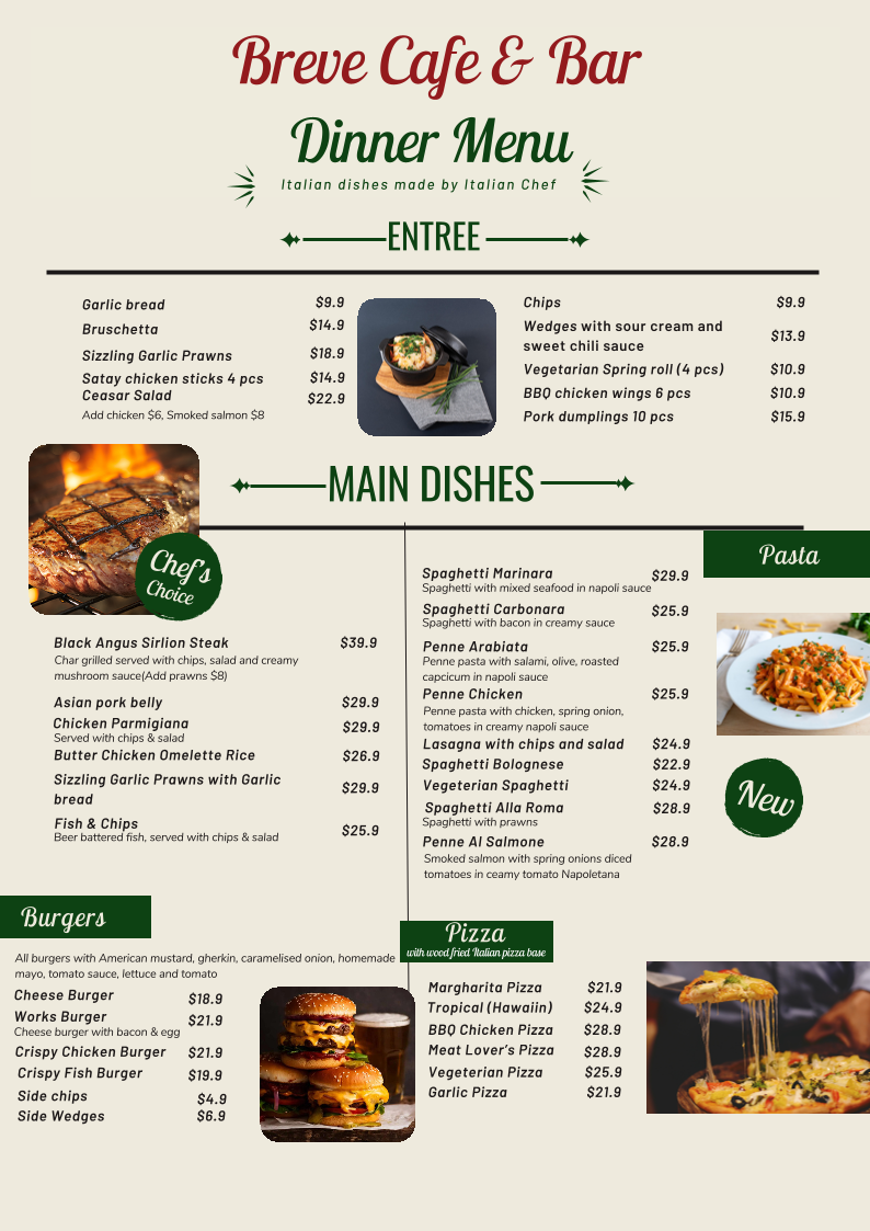 For a refreshing palate cleanser, the Fresh Lemon & Lemon Curd dessert combines lemon sorbet with candied lemon and mint leaves, also at A$17.90. It’s a bright choice that balances the richness of their other offerings. The diverse menu appeals to various tastes, with an array of Asian and Western dishes. Customer reviews reflect a consistent satisfaction, with many praising the generous portions and flavors. Swing by Breve's Cafe & Bar for a memorable food experience, crafted with love and creativity.
